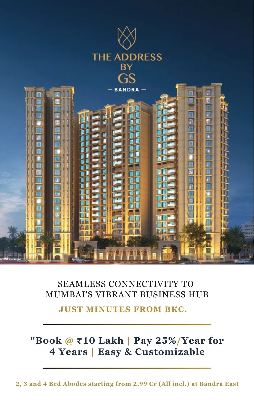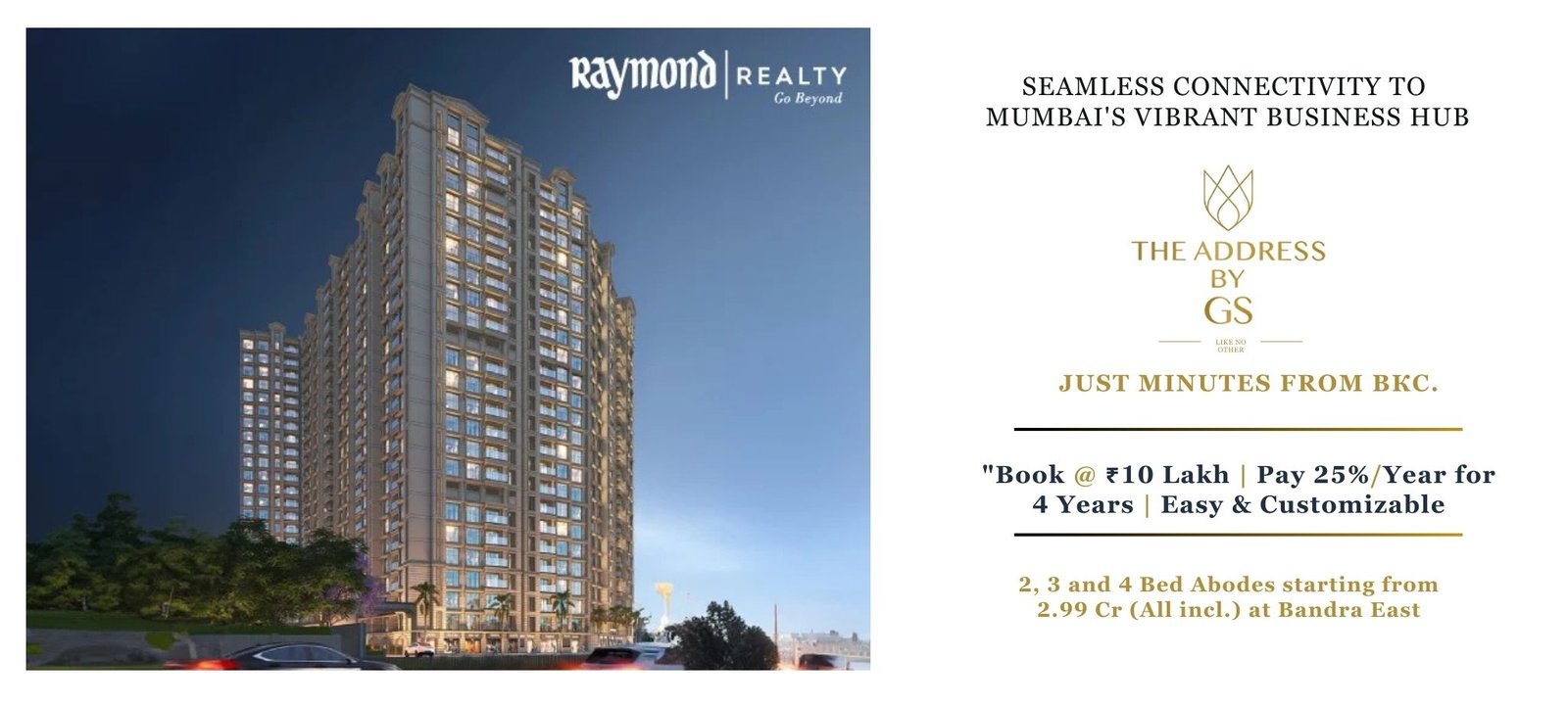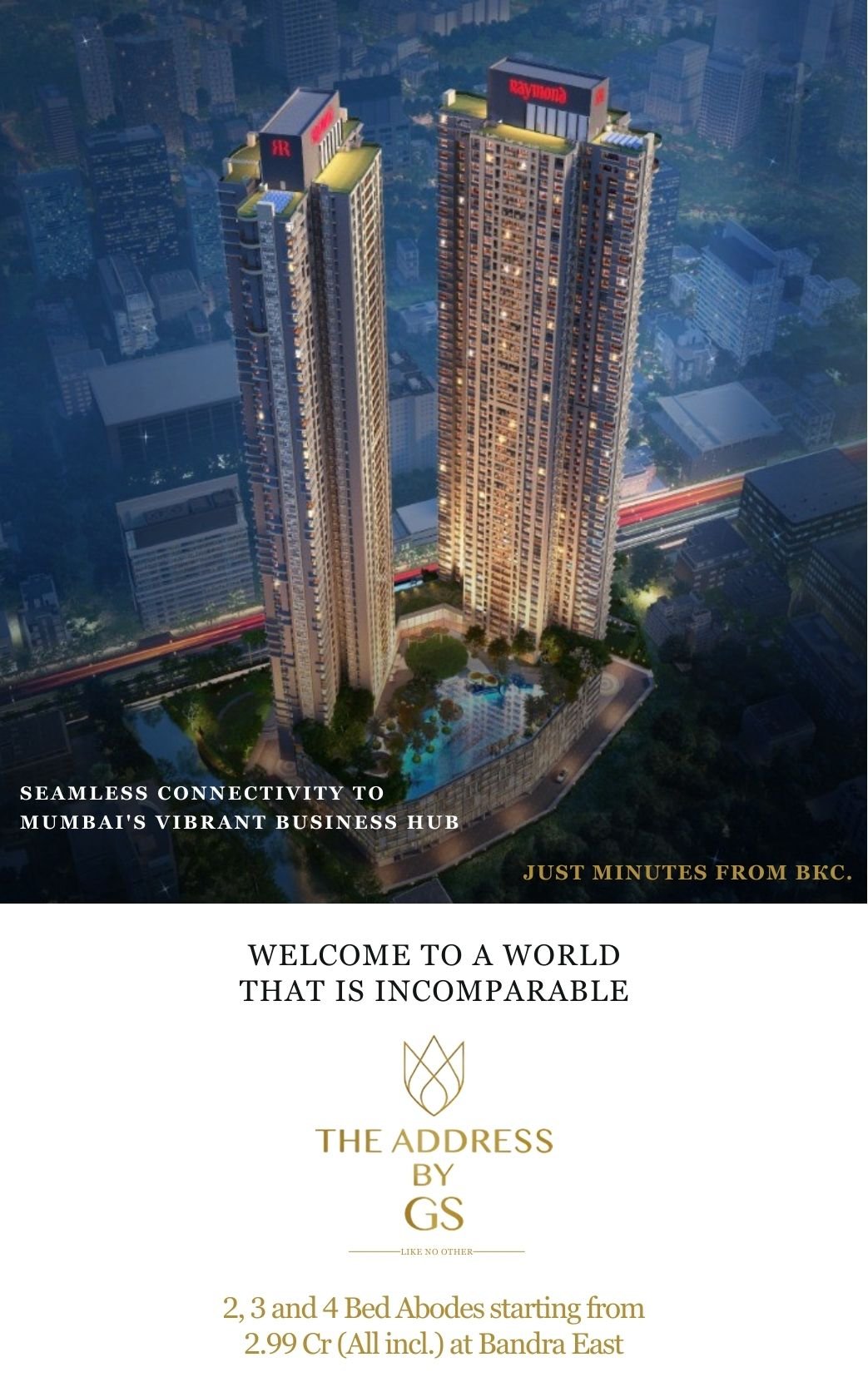 Raymond Realty – The Address By GS Bandra East. Strategically located near the bustling business hub of BKC, this premium development ensures seamless connectivity for both professionals and families. With its prime location and world-class amenities, Raymond Realty BKC redefines urban living, offering unmatched convenience and sophistication. Extending its allure to nearby areas such as Nirmal Nagar, The Address Bandra East stands as a symbol of exclusivity and modern luxury. This project embodies timeless elegance, providing residents with a lifestyle that perfectly balances opulence and contemporary living.